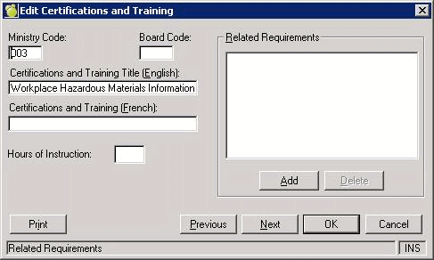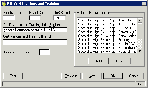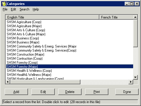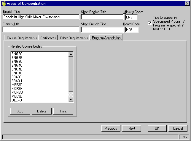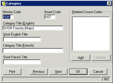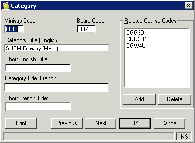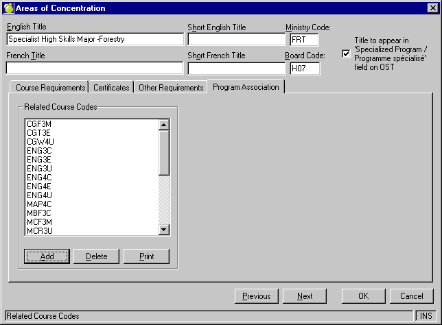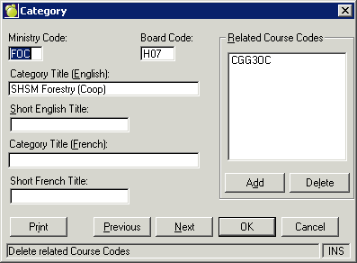 This tab works similar to the 'Define SHSM Categories' area where users can add all associated codes in one location (rather than stepping through each code in the code file). Users can add, delete or print the codes that are currently associated with the SHSM Sector.