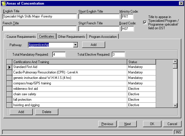 The addition of related course codes SHOULD INCLUDE ALL ENGLISH, MATHEMATICS as well as any Other credits associated with the requirements for that sector (i.e. for Forestry this should include all approved Science and/or Canadian and World Studies course codes.