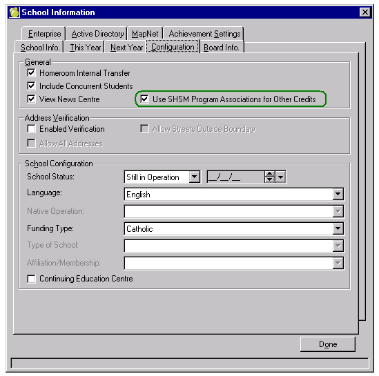 SHSM Program Association - This new feature allows users to track the 'Other' credits (including English and Mathematics) portion of the SHSM sector requirements. To activate this feature, go to File, School Setup, School Information. Select the 'Configuration' Tab, and ensure that the 'Use SHSM Program Associations for Other Credits' has been selected (has a checkmark).