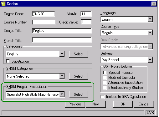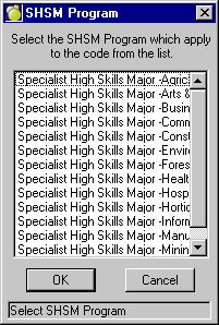 In the Codes file (File, School Setup Codes), a new pull down menu and select button are now visible within the edit screen. Users can manually step through the code file for each SHSM Program that is being offered at the school, and choose which codes are allowed to count toward the English, Mathematics and Other credits for the SHSM Sector requirements.