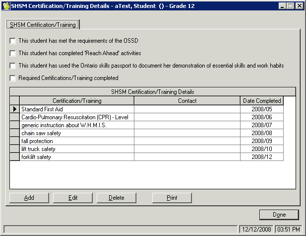 In this area users are able to enter in any certifications or training that the student completed, as well as the Reach Ahead activities and the Ontario Skills Passport requirements (checkboxes).