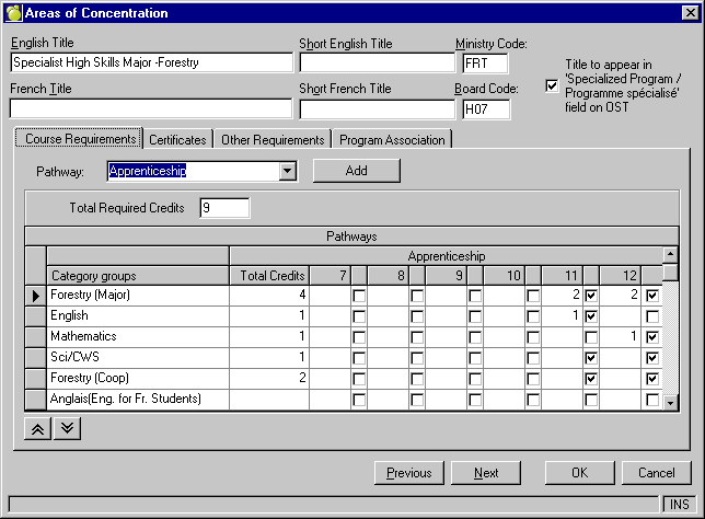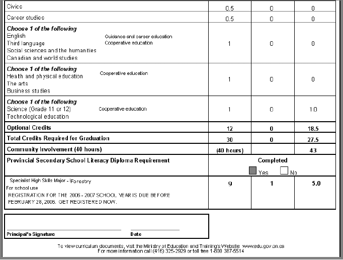 This table has been added to enable the tracking of each pathway. Within some SHSM Sectors, the requirements are different depending upon which Pathway the student is taking (note: this is not the case for all sectors, just some). The Forestry sector is one of these sectors. The Apprenticeship, College and University pathways require that a student earn a Grade 11 English and a Grade 12 Mathematics, whereas the Workplace pathway requires a Grade 12 English and a Grade 11 Mathematics.