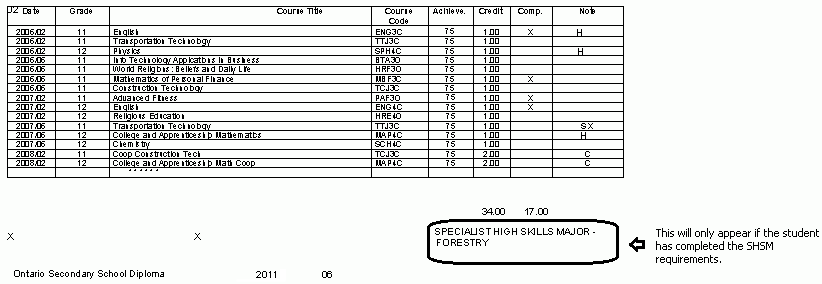 All students who are enrolled in a Specialist High Skills Major program will have features appear on the printing of the OST. This includes an indicator for each SHSM course that has been completed, as well as information regarding which SHSM the student is currently enrolled, and whether the requirements have been completed for this program (see sample below).