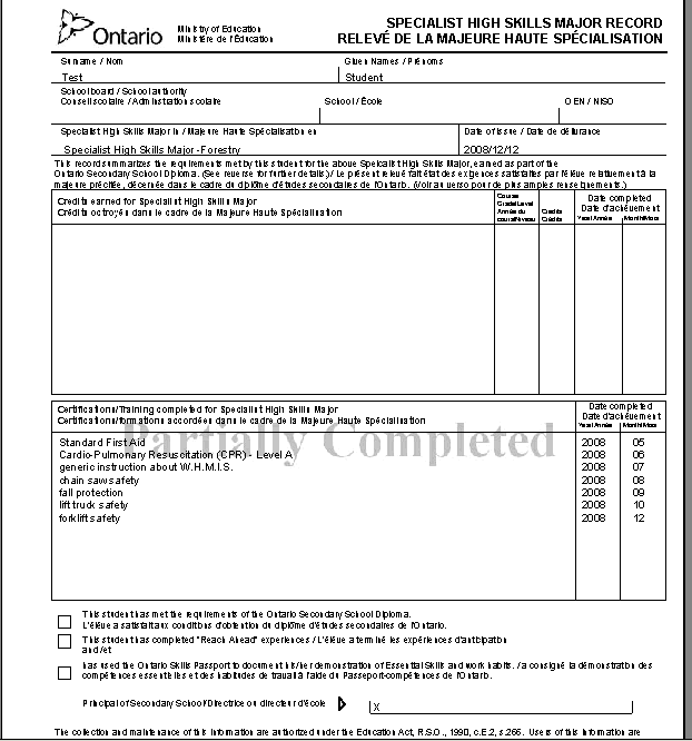 Select the Print on blank paper option to see the grid. A watermark of 'Partially Completed' will appear if the student has not completed all area of requirements for the SHSM program.