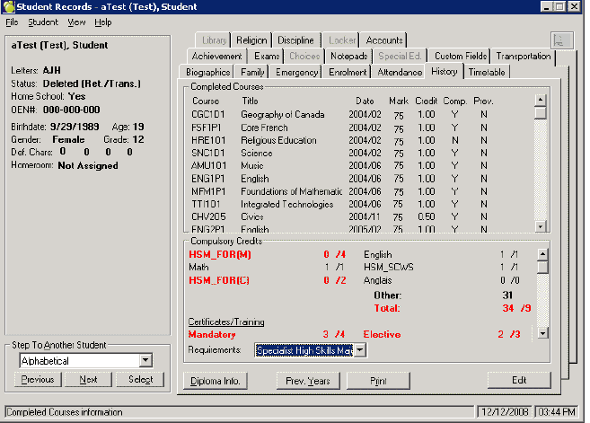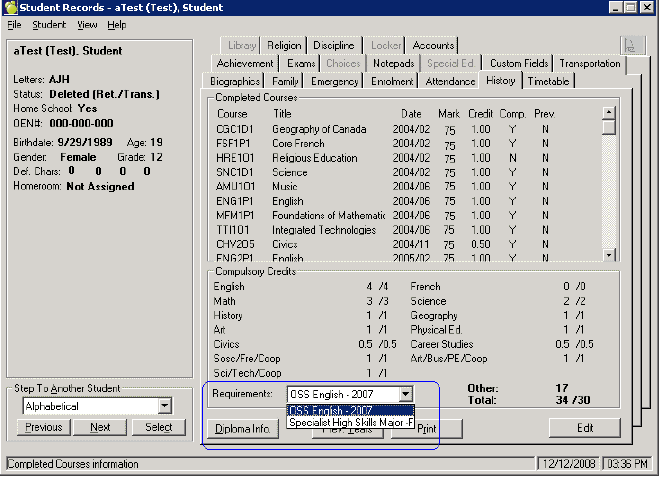 Once this information has been entered for the student click Done. Users will now see that a Requirements pull down menu is now available when viewing the History Tab. This menu option is only activated if the student has more than one requirement assigned (i.e. OSS English and a SHSM). Therefore when stepping through student records users will be able to distinguish between those students who are taking a SHSM and those that are not based on whether or not this menu option is active.