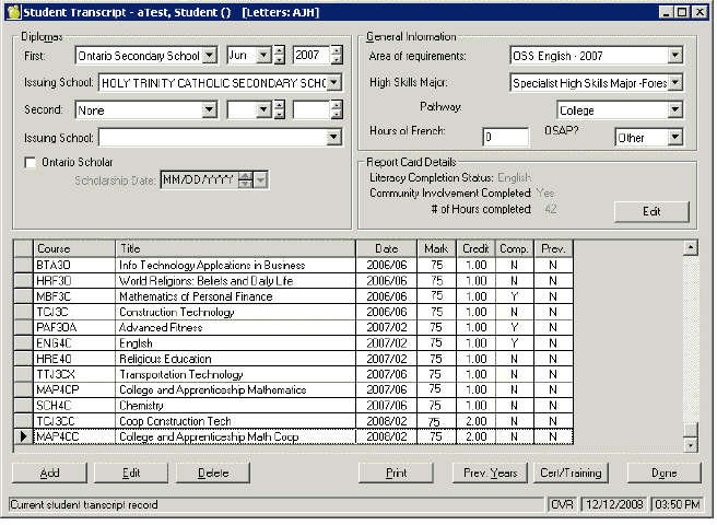 For students who are enrolled in the Specialist high Skills Major Program, the 'Credits' page of the Ontario Provincial Report Card (Secondary version) - includes the SHSM credit totals. This information will only appear for those students registered in the program. Please note that these changes are based on the categories that have been assigned in the codes file. Therefore if your school is offering a course that has not been offered in previous years, please ensure that the course code has been added to the code file with the appropriate High Skill Major category.