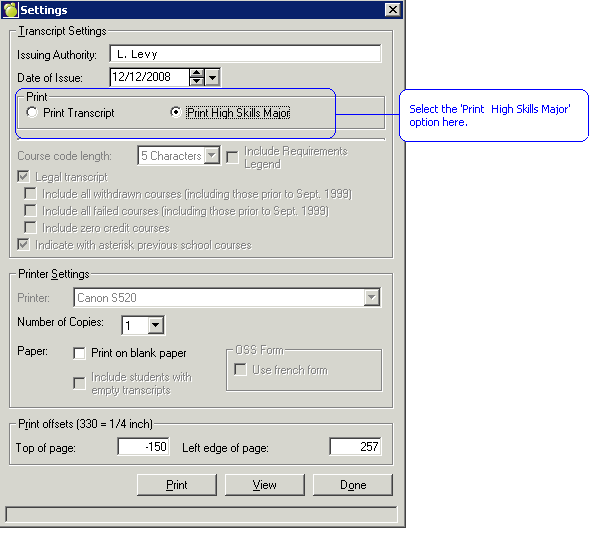 The printing of the Specialist High Skills Major Record can only be done once the student has completed the program, or is transferring to another school. An option within the Print Transcript settings screen has been added to allow users to print a copy of the official Specialist High Skills Major Record.