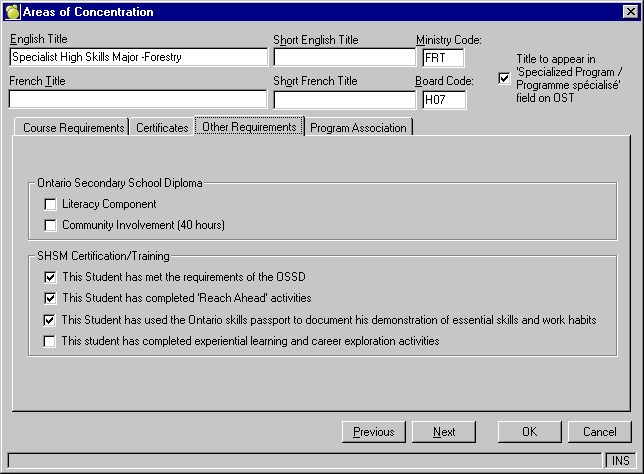 This tab allows users to specify any other areas that the student must complete in order to complete the requirement. In the case of the SHSM Program, students are required to complete 'Reach Ahead' activities, Ontario Skills Passport, experiential learning & career exploration, as well as all requirements of the OSSD.