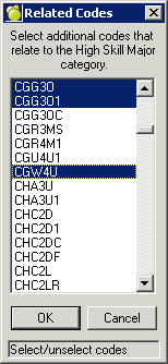 Select the Add button and a list of course codes will appear. This list is populated with all of the course codes that have been entered in the Codes file (File, School Setup, Codes). Users can select multiple codes at one time. Select all of the codes that the school offers pertaining to the Forestry Sector (Note: Do not select any co-op courses, or Other component courses - only the in Major school component should be selected). Once all of the codes have been highlighted, then select the OK button.