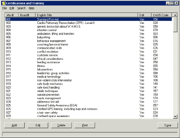 2) Items that are lowercased are names of the areas or categories. Schools/Boards may offer a specific certification or training program that pertains to this area. For example, MIN 011 - "customer service" is the area or category, in this case, a board may offer a certificate program called "Service Excellence" that fits into this category, whereas another board may have a program called "A+ Customer Care" that would fulfill this same requirement. Schools could also offer both options. If schools/boards have a scenario where multiple certifications fulfill a specific area (as listed above) they are able to enter both titles into the table. When doing so, the user must ensure that the OnSIS # (Min # should be a unique entry) are the same for both entries. OnSIS only wants to collect the area or category of these non-specific courses not the title itself.