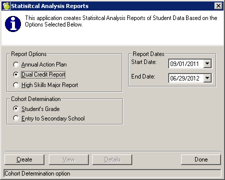 Choose the Dual Credit Report option, the Cohort Determination that you would like and the Report Dates desired. Select the Create button to generate the report.