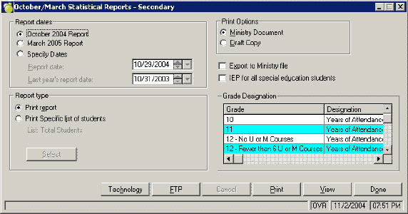 11. As a suggestion, create a list of all the students enrolled in your school on October 29th, 2004. Keep this list for reference next year. By doing this, when you print the October Report next year and you have an inaccurate enrolment number for October 2004, you will have a list to cross reference to find the missing/extra student. It is suggested that you make a backup of the school's data on October 31st and keep it for reference next year.