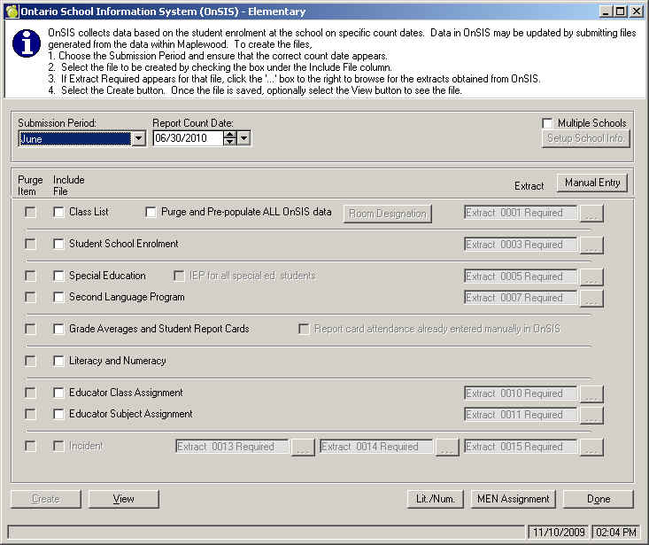 - Once the submission period is opened, obtain extracts from the Ministry’s OnSIS application. Extracts provide information about the data that OnSIS has pre-populated into this submission period. For further information on extracts, read Pre-populated Data and Extracts. Note: When the Educator Assignments extract (extract 009) is required by Maplewood, and the educator data has been updated after this step, a new extract 009 is required.