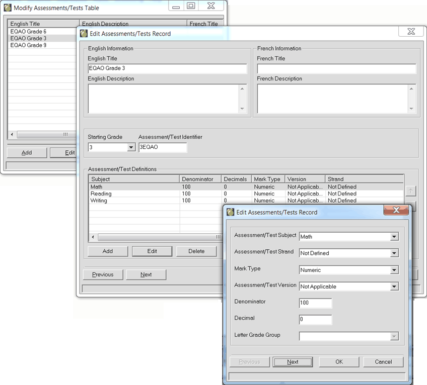 In this example, the same assessment definitions may be used each year since the assessments were defined without any date references. The time period is separate from the assessment definition, so the user selects the assessment and time period during the entry or import of the test results. Grade 3 and 6 are setup the same except for the grade reference of 3 vs 6 as shown here for EQAO Grade 3.