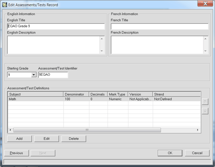 From Central Office, select Marks, Assessment Results, Define Assessment/Tests. Enter the title of the assessment, the starting grade (students in this grade and higher may be administered the assessment/test *), and an Identifier. Grade 3, 6 and 9 EQAO Assessments must be defined using the identifier 3EQAO, 6EQAO or 9EQAO (note the last letter is a capital "O", not a zero).