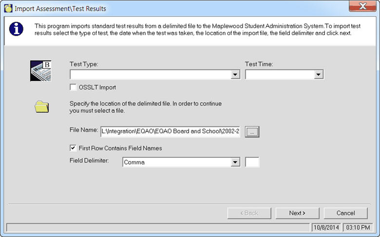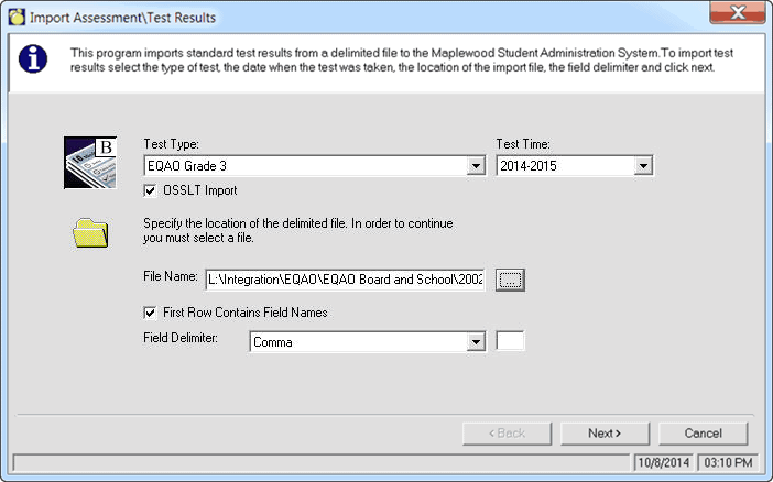 If the EQAO results are available in a file, they may be imported into Maplewood. The results must be in a file format such as csv or txt, and there must be a common field delimiter between fields (e.g. tab or comma between each field in the file).