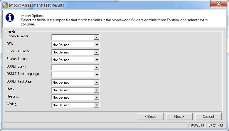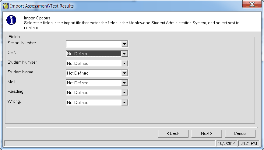 Click the Next button and then use the drop down list to select the fields in the file, corresponding to the fields requested by the program. Ideally, the import file should contain all of the requested fields (School Number, OEN, Student Number (school student number), Student Name, and the assessment/test results for the subject/strand(s) defined in the test. It may be possible to import without all of the requested fields (e.g. if only OEN is defined, the results will be imported into the student with the corresponding OEN).