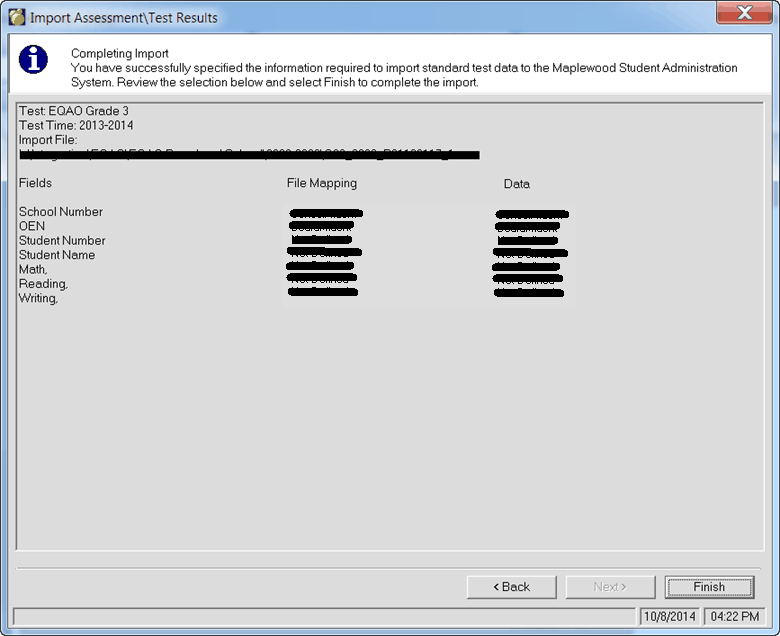 Click Next. After this screen you will be presented with a summary screen that will show you all the selections that you have made and if everything looks ok for the Data column (showing the data to be imported for the first student), click on Finish to import. If changes are needed click the Back button to make your changes.