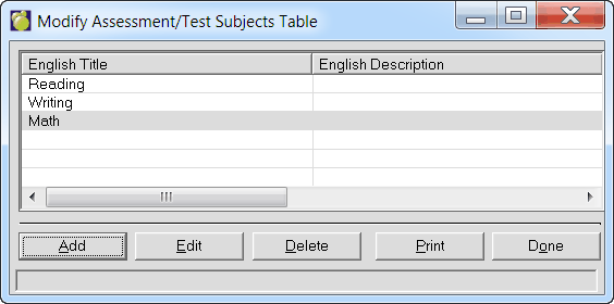 Select Marks, Assessment Results, Define Assessment/Test Subject. If the subject of the test is not listed, use the Add button to add a new subject to the table of subjects. For grade 3 and 6 EQAO tests, the subjects must be Math, Reading and Writing. Please set up the titles exactly as shown here since the title is used when extracting data using Maplewood's data mining views. The description and identifier are optional.