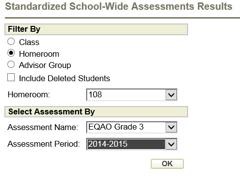 The example setup in this document will result in a set up similar to this in Maplewood connectEd, where teachers can access EQAO results after they are imported. In Maplewood connectEd, first the teacher selects the students (by class, homeroom, or advisor group) and then selects the assessment name and time period as shown here: