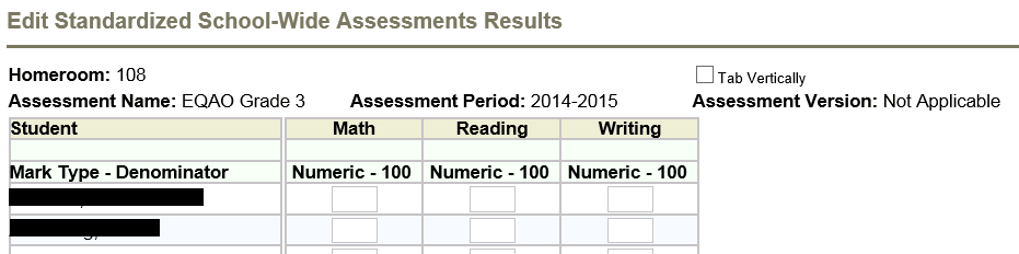 EQAO (Education Quality & Accountability Office) test results may be imported into the School Wide Assessment area in Maplewood and they are retained as part of the student's record for historical reference.