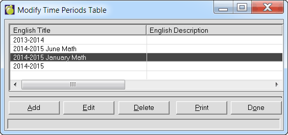 Each assessment has a time period, a user-definable time period that provides information as to when the student is assessed. The Title can be anything (e.g. 2013-2014, Spring 2014, Winter 2015, etc). Set the Start Date and End Date of the assessment. Dates can be any calendar range (does not have to fall within the school calendar). The description is optional. Time periods are not part of the definition of the assessment (step e), however the entry/import of student results will require the selection of the assessment (defined in step e) and the time period defined here. In this example, if a board wants to distinguish between the grade 9 Math that can be written in January vs those who write the test in June, then specific time periods may be setup for the January and June Math as shown here.