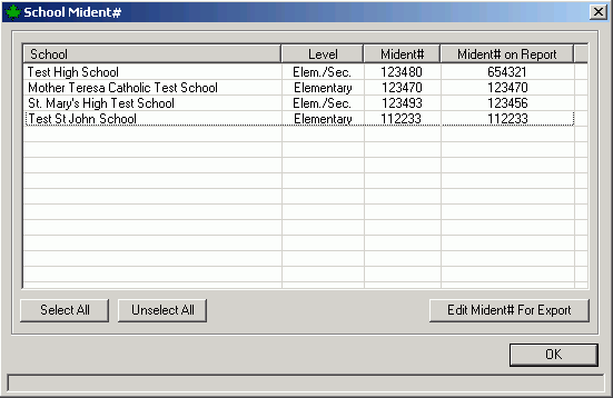 When creating the elementary OnSIS batch files, secondary schools with grade 8 or lower in the table of grades will also appear. These high schools will appear with the Level indicated as “Elem./Sec.” along with the Mident# assigned to the school. Since these combined elementary and secondary schools have a different Mident# for the elementary school, use the Edit Mident# for Export button to enter the elementary school’s mident number into the Mident# on Report column as shown here: