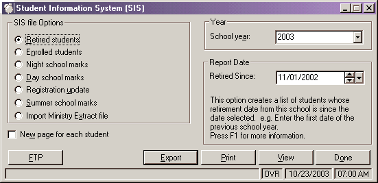 This allows you to create a file with all the students who either transferred or retired since the date of the previous year's enrolment file to October 31st of the current year. Enter the current school year (e.g. for 2003-2004 school year, enter 2003), and the report date. This will send those student's whose retirement date from this school is since the date selected. e.g. Enter May.16/2003 to get a list of all students who have retired since this date.