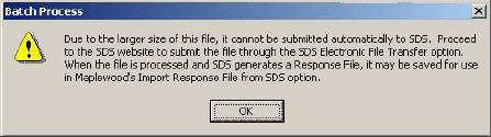 "Due to the larger size of this file, it cannot be submitted automatically to SDS. Proceed to the SDS website to submit the file through the SDS Electronic File Transfer option. When the file is processed and SDS generates a Response File, it may be saved for use in Maplewood's Import Response File from SDS option."