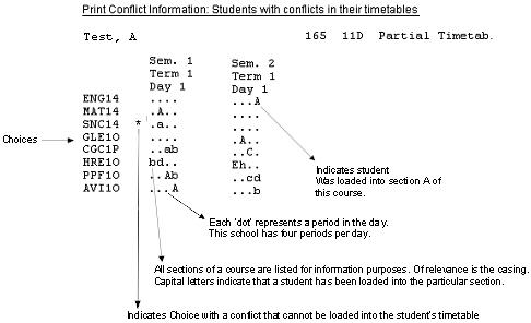 Only students who have conflicts in their timetables will be printed. For best results, be sure when Loading Students, to check Load Partial Timetables where Single Conflict Exists. This will enable you to better analyze the conflicting choices (the resulting information indicates the period assignments for each course in the student's choices). If a single conflict is found in the student's timetable, the choice which was not placed into the student's timetable is marked by an '*' asterisk, meaning the choice conflicts with a loaded choice or "s" meaning the choice was not loaded due to sequencing constraints as defined in the scheduling courses file. Students with multiple conflicts will also be printed here (marked as Conflict in Timetable).