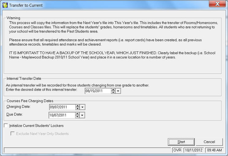 When the new checkbox to 'initialize student lockers' on Transfer To Current is checked, the program will do the following: