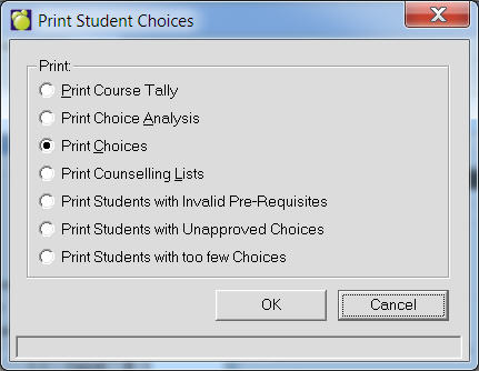 Choose Scheduling, Print Students’ Choices and click the Print Course Choice Analysis option.