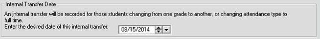 Internal transfers are date specific entries that record when a student makes a change to key fields that are used in date specific reporting. For example, when a student's grade advances from grade 7 to 8 over the summer, there would be an internal transfer dated August 15 for grade 7 to grade 8. If a report were run to determine a student's grade the previous June, the student would be considered in grade 7, however, if the report were run for September, the student would be considered grade 8. Internal transfers are visible in the student's record, using the Int. Transfer button on the Enrolment tab.