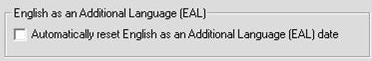 Check the box Automatically Reset English as an Additional Langauge (EAL) Date, if the student's EAL assessment date should be reset to the first day in the new school calendar. Saskatchewan schools must report an EAL date that is within the new school year as part of the SDS reporting.