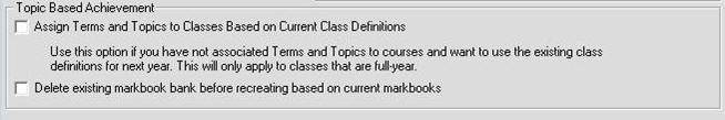 Terms and Topics need to be assigned to every class if the school uses Maplewood for report cards (via the topic based achievement functionality in Maplewood connectEd). For most elementary schools, classes are scheduled for the full year. These are the types of classes that can be automatically given the same terms and topics in the new school year, if the user checks the box Assign Terms and Topics to Classes Based on Current Class Definitions. Note: if this option is not checked, the full year classes will be automatically assigned the terms and topics defined in the courses table.