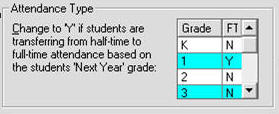 If students become full time when they advance to a specific grade (e.g. students move from half time to full time when they move to grade 1), put a Y beside grade 1 to have the program automatically change the student's attendance type to full time. An internal transfer is automatically recorded (e.g. August 15th Half Time to Full Time).