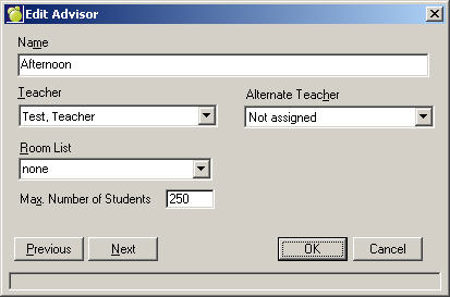 To add an advisor group, choose File, School Setup, Advisor Groups. A list of Advisors (if any) will appear. To add an Advisor, click Add. To edit an existing Advisor, click Edit. This is an example of an editing box. The adding box will look the same with no information entered.