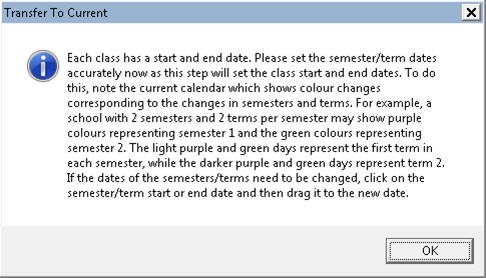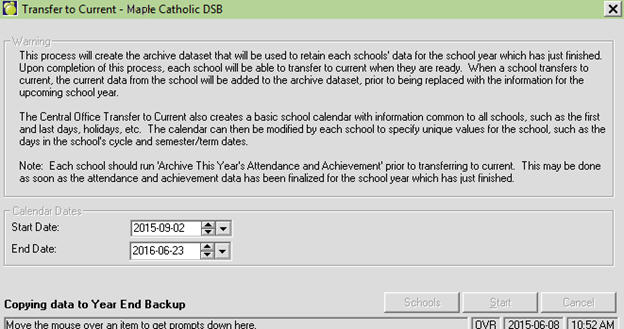 From the Transfer to Current screen, TAKE CARE to ensure that the correct calendar start and end dates are entered. These dates will be used to prompt the start and end dates for all schools as they transfer to current.