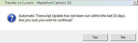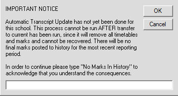 If you chose to continue, you will be forced to acknowledge that you are proceeding with the update, and are fully aware that there will be no marks in history for the final semester of the school year.From the Select School interface, select the school, or the group of schools for which you wish to run the Transfer to Current.
