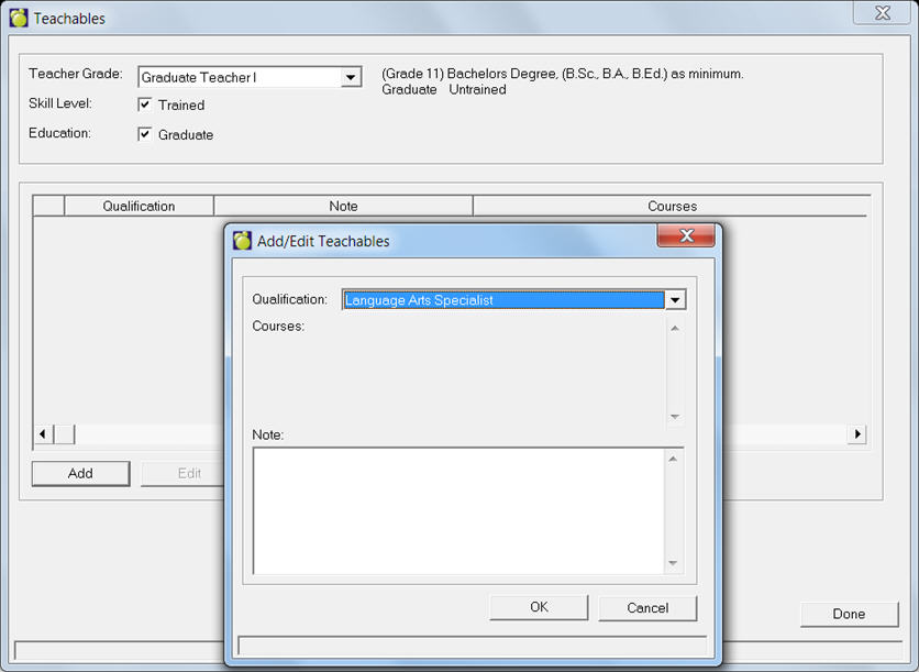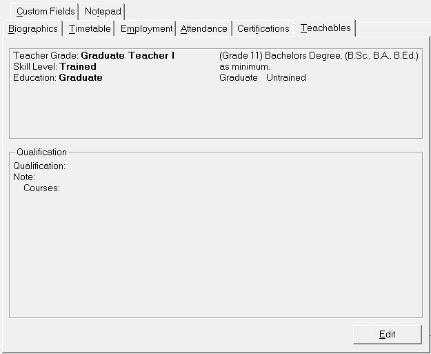 You will see an editing box for Teachables when you click Edit. Any qualifications will be displayed. You can add by clicking Add or edit by selecting the qualification and clicking Edit.