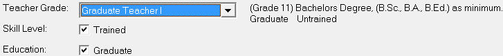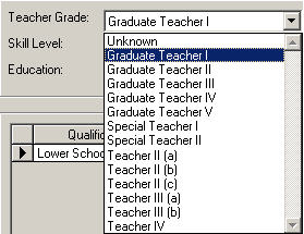 The Teachables tab should be edited for each teaching staff to indicate the teacher’s Teacher Grade, and whether they are Trained/Untrained and if the education level is Graduate or Non-Graduate. Choose Staff, Staff Records, select a staff member and click the Certification tab to see this information box.