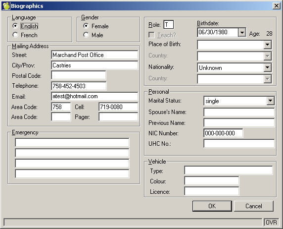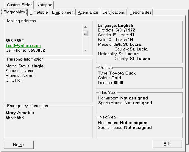 Caribbean Community and Common Market NIC and UHC numbers are specific to St. Lucia. The Biographics tab includes the Sports House if the selected teacher is assigned to a Sports House.
