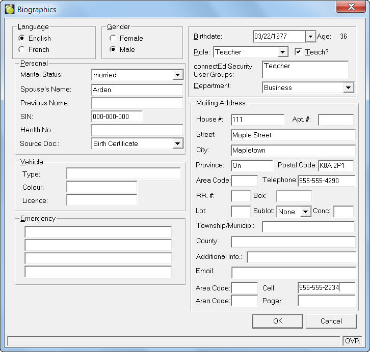 The Role field should use P for the Principal, V for the Vice-Principal, and T for Teachers. The “Teach?” box must be checked is a staff member is to be assigned to a homeroom or class.