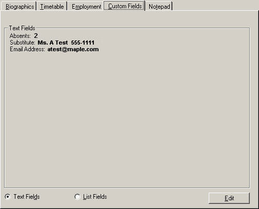 Note: To edit the list of pre-defined Custom Fields, from your main Maplewood screen choose Staff List Fields or StaffText Fields. Text Fields