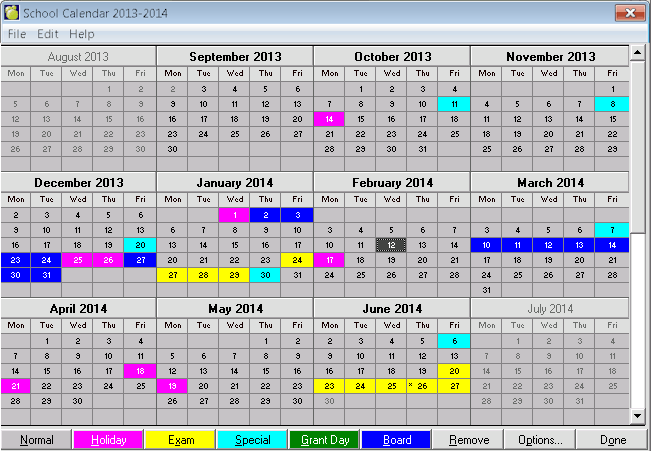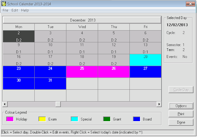 Changing The Type Of Day - From the year view (not a single month view) of the calendar, select a day by clicking it and assigning an day type by clicking one of the option buttons at the bottom of the screen. You can specify Holidays, Exams (for Secondary Schools), Special Days, Grant Days and Board Days. For example, click cell for December 25th and then click the Holiday button to make December 25th a holiday in the calendar.
