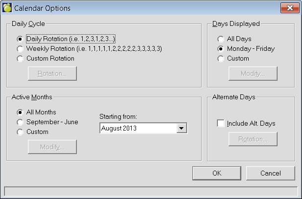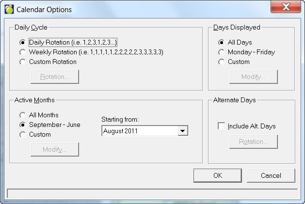 Options Button - From the year or month view, use the Options button to control the presentation of months and days to be displayed in the calendar by selecting the preference from the Active Months and Days Displayed frames. The Options button is also used to define daily and alternate day (if applicable) rotations. This is the Options interface: