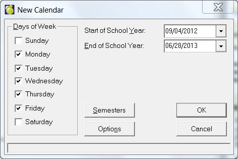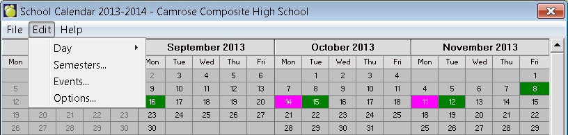 To access the editing screen, choose File, School Setup, Calendar, Edit.