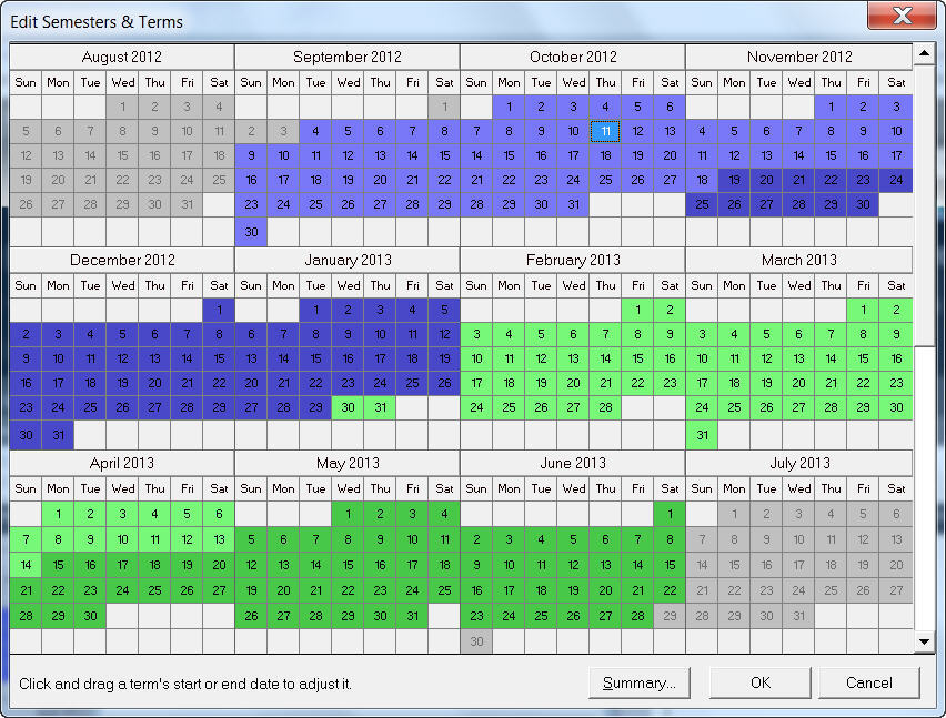 Clicking on the Summary button will show a preview pane of the Semester and Term dates, clearly indicating start and end dates.