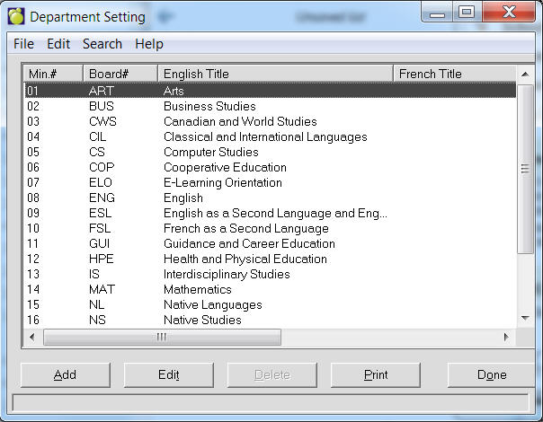 To add Departments to your school, choose File, School Setup, Departments. A box will appear with a list (if any) of departments already set up.