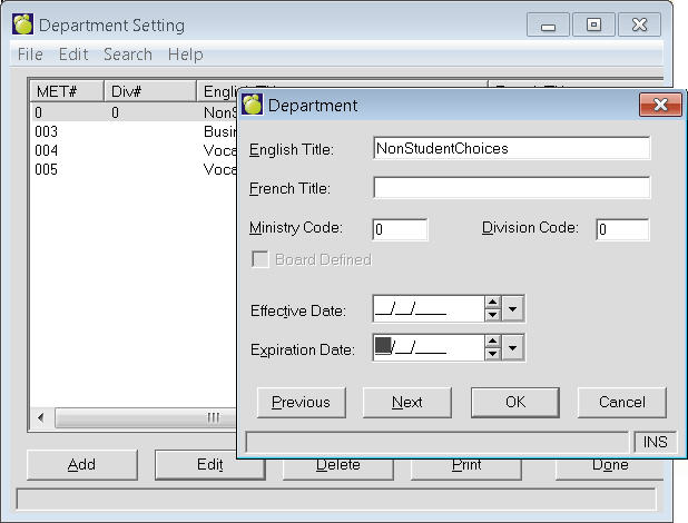 When adding, you can enter the English, French Title and the Ministry Code for the Department.